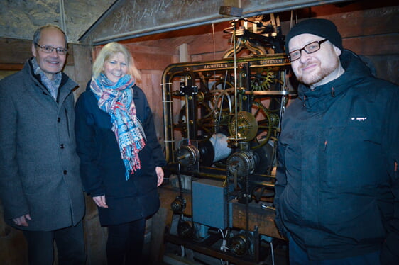 Gemeinsam steigen Finanzkirchmeisterin Iris Espelöer, Pfarrer Jürgen Jerosch und Presbyter Jan Trimpop die engen Stiegen zu dem einzigartigen Uhrwerk der Kirche hinauf. Keine einfache Angelegenheit, da der Platz sehr beengt ist. Die drei klettern über eine schmale Holztreppe bis hoch zu den Glocken. Man kann sich nur schwer der geschichtlichen Bedeutung des Turmes verschließen, wenn man sich inmitten der dicken Mauern befindet. Hier spürt man hautnah und bei jedem Schritt die Präsenz von Generationen tapferer Wehrleute, die in diesen Mauern für den Schutz der Stadt sorgten.