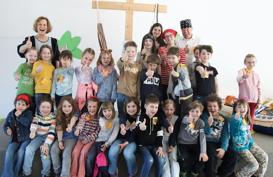 Als Kinderbibelpiraten zeigten die Mädchen und Jungen „Flagge für Jesus“, wie das Motto der erlebnisreichen Tage lautete. Das Mottolied „Wir sind die Kinderbibelpiraten“ hatte Nina Stahlschmidt auf die bekannte Melodie „What shall we do with the the drunken sailor“ getextet. Als „Piraten“ lernten die Kinder, die täglich gemeinsam im Plenum starteten und sich danach in Kleingruppen aufteilten, die biblischen Geschichten rund um Petrus und sein Leben als Fischer kennen. Dabei ging es auch darum, Brücken zum Heute und Jetzt der Kinder zu bauen und auf Themen wie Angst oder Vertrauen einzugehen.