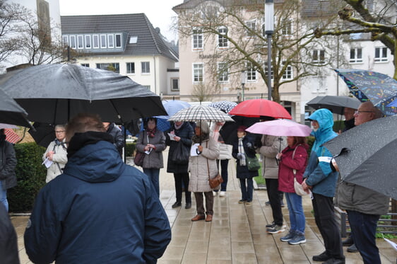 Er erinnerte aber auch auf die heutigen Kriege in der Ukraine und Nahost und ihre Auswirkungen auf alle und äußerte den Wunsch, dass diese schnell beendet würden und anschließend eine Versöhnung zu einem gemeinsamen Miteinander kommen möge. „Das Gedenken an diesen 28. März 1945 erinnert uns daran, welches Leid Krieg und Gewalt auch über unsere eigene Stadt gebracht hat. Es ist zugleich Mahnung und Auftrag, uns gemeinsam für Frieden, Demokratie und ein respektvolles Miteinander einzusetzen“ , so der Bürgermeister. Nach der Niederlegung eines Blumengesteckes in den Farben der Stadt (rot–weiß) lud er alle Anwesenden zum nachfolgenden „Ökumenischen Friedensgebet am Brunnen“ ein. Eine Einladung, die trotz des Regens viele Teilnehmerinnen und Teilnehmer an der Gedenkstunde wahrnahmen.