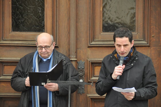 Prädikant Wolfgang Dröpper, hatte das Wander-Nagelkreuz von Coventry, das am nächsten Tag (Palmsonntag) der evangelischen Kirchengemeinde Attendorn-Lennestadt offiziell übergeben werden sollte, schon einmal mitgebracht. Er erläuterte kurz die Entstehung und Geschichte dieses Kreuzes und lud die Anwesenden dazu ein, sich gemeinsam der Aufgabe zu stellen, Gegensätze zu überbrücken, Brücken zu bauen und nach neuen Wegen in eine gemeinsame, friedliche Zukunft zu suchen – ohne Hass und Gewalt. Das Friedensgebet schloss mit dem gemeinsamen Versöhnungsgebet von Coventry, das er zusammen mit Bürgermeister Pospischil vorsprach.