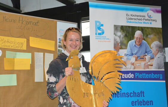 Was bedeutet für mich Heimat? Antworten auf diese Frage konnten die Besucherinnen und Besucher auf kleine Karten schreiben und an eine große Tafel heften. Silke Vieregge vom Projekt „LebensFreude“, die den Nachmittag moderierte, trug die Antworten vor. Sie hatte ein Stück Heimat mitgebracht: Den Hahn, der früher die Kirchturmspitze schmückte. Der goldfarbene Vogel war auf mysteriöse Weise verschwunden. Nach sechseinhalb Jahren tauchte er im Februar 2020 wieder auf. Ein Telekom-Mitarbeiter fand ihn in einer Wiese, etwa hundert Meter von der Kirche entfernt. Auch an diese Geschichte erinnerten sich die Besucherinnen und Besucher. Später frischte ein Quiz zum Thema Sauerland ihr Gedächtnis auf.